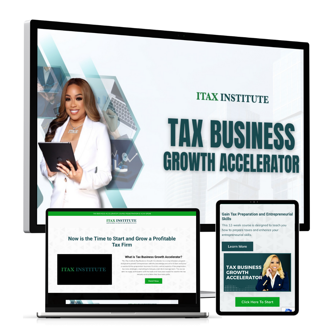 The iTax Institute Tax Business Growth Accelerator is a self-paced course that provides the skills, tools, and strategies to launch, grow, and scale a profitable tax preparation business, from marketing to client management.