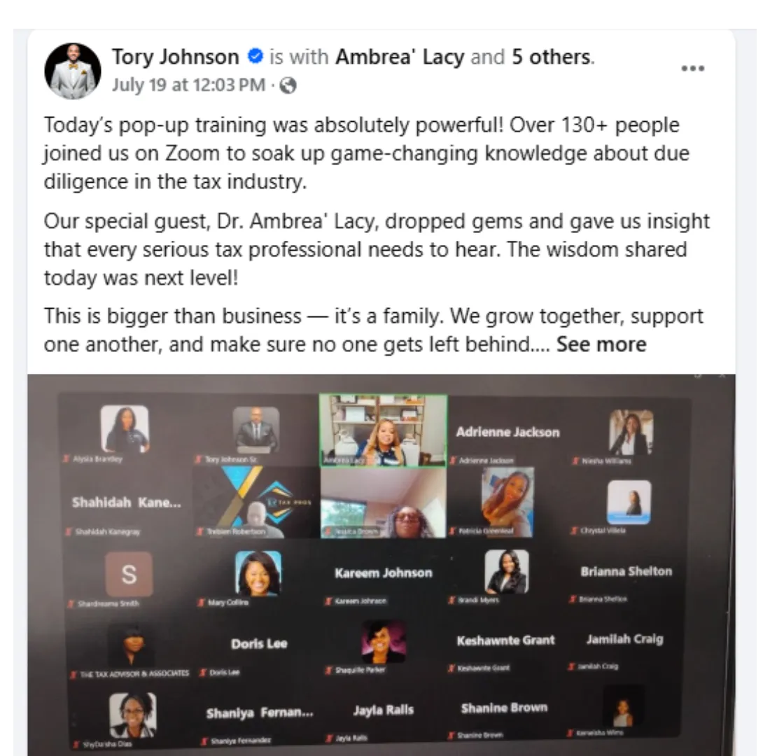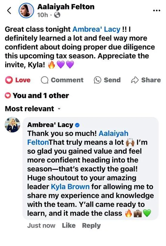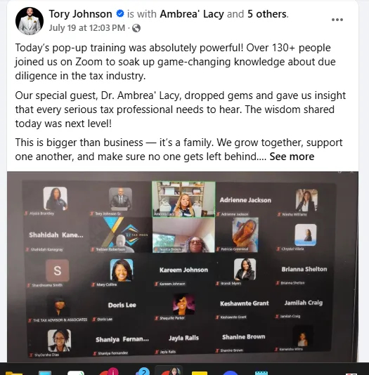 As the founder of a top-tier tax software company, Ambrea’ blends innovation with real-world strategy, giving professionals the tools and confidence to scale with purpose. Whether you’re just starting out or ready to level up, Ambrea’ is here to help you lead, grow, and succeed.